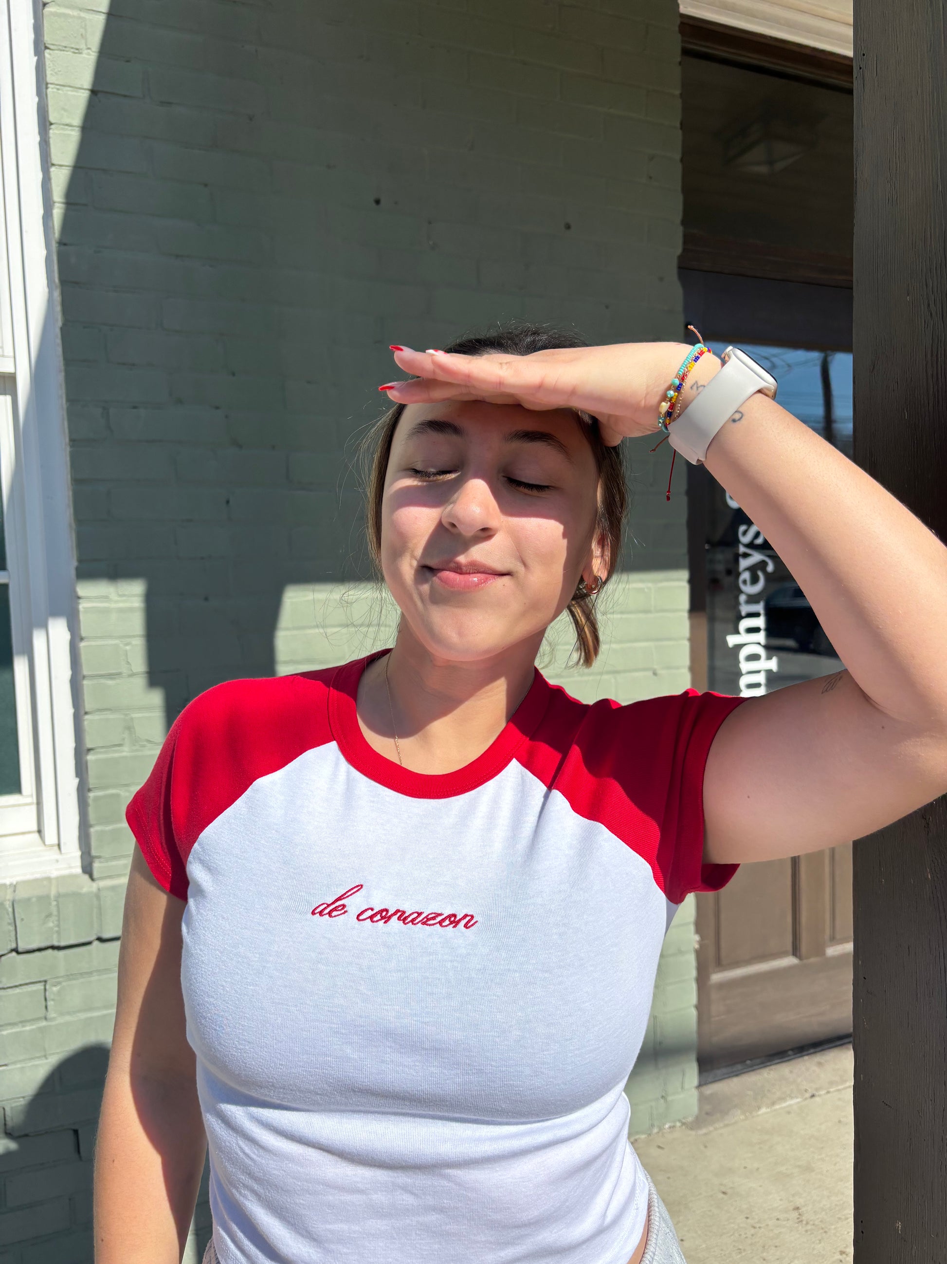 For the girls who love from the heart. With contrast red sleeves and a cropped fit, this piece is made to be styled with confidence and cariño. A love letter to your inner romantic — because everything you do, you do de corazón.